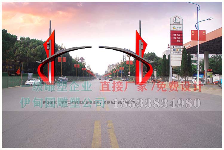 大門不銹鋼雕塑制作流程:設計圖紙→骨架放大→板材鍛造→整形修復→焊接成型→環(huán)氧底漆→氟碳面漆→分節(jié)運輸→工地安裝。