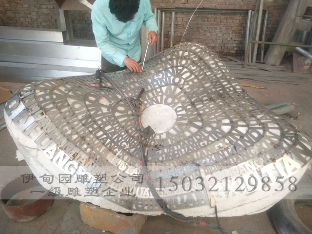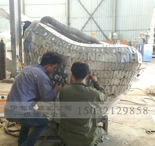 鏤空剪紙雕塑除了要有高超的焊接技術還需要足夠的耐心,把字符按照圖紙要求逐個拼裝焊接起來。