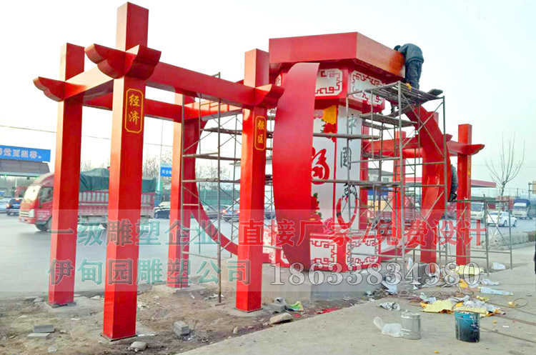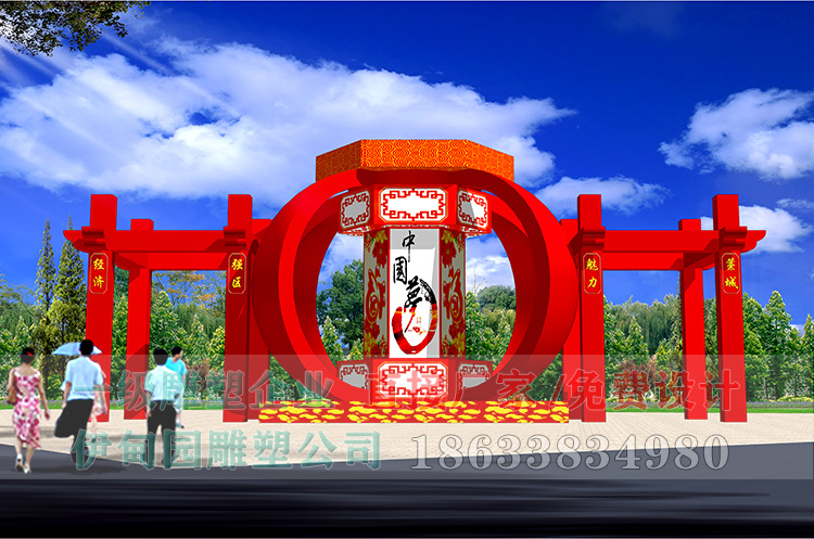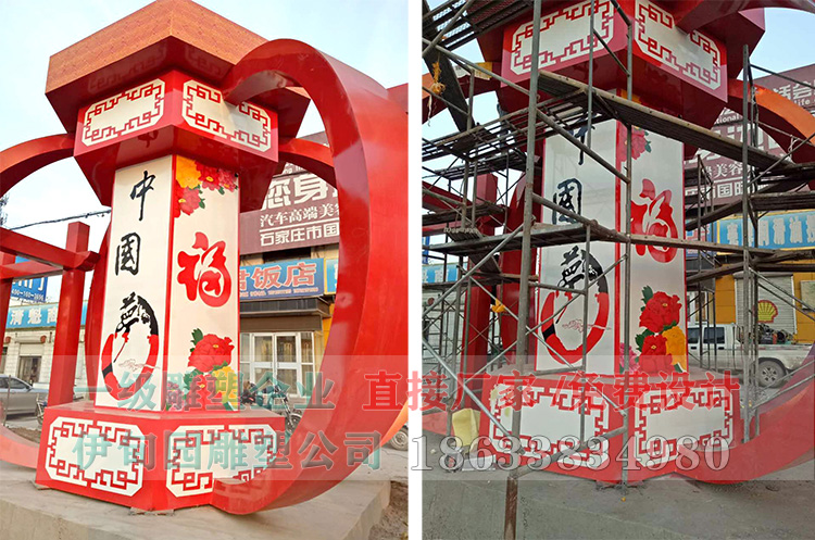 不銹鋼宮燈雕塑,總長(zhǎng)12.5米 高5.5米,安裝于河北省某商業(yè)街綠化帶。雕塑以該城市特色“宮燈”為主題,八角立柱為支撐,柱子上分別寫有魅力、藁城、經(jīng)濟(jì)、強(qiáng)區(qū)八字,凸出了藁城市響應(yīng)國家號(hào)召,大力發(fā)展經(jīng)濟(jì)的寓意。