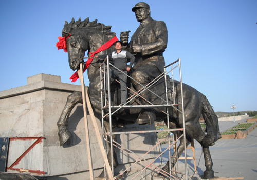 人物雕塑制作完成后,根據(jù)其材料(紅銅、黃銅)的不同性質(zhì),選擇合適的方法進(jìn)行表面處理。如:紅銅的清洗,首先需要用稀釋的硫酸液將紅銅表面進(jìn)行刷洗,除去人物雕塑表面的油污、銹垢,然后用自來(lái)水沖洗掉具有腐蝕性的稀硫酸,這樣就可以為人物雕塑進(jìn)行表面著色。先將化學(xué)藥劑倒入玻璃容器中,然后用干凈的毛刷將化學(xué)藥水涂刷在人物雕塑表面進(jìn)行化學(xué)腐蝕,稍后等色彩附著在雕塑表面后,用銅刷拋刷,其后用清水洗凈擦干,上光、打蠟、保護(hù)其表面,最終完成人物雕塑制作。