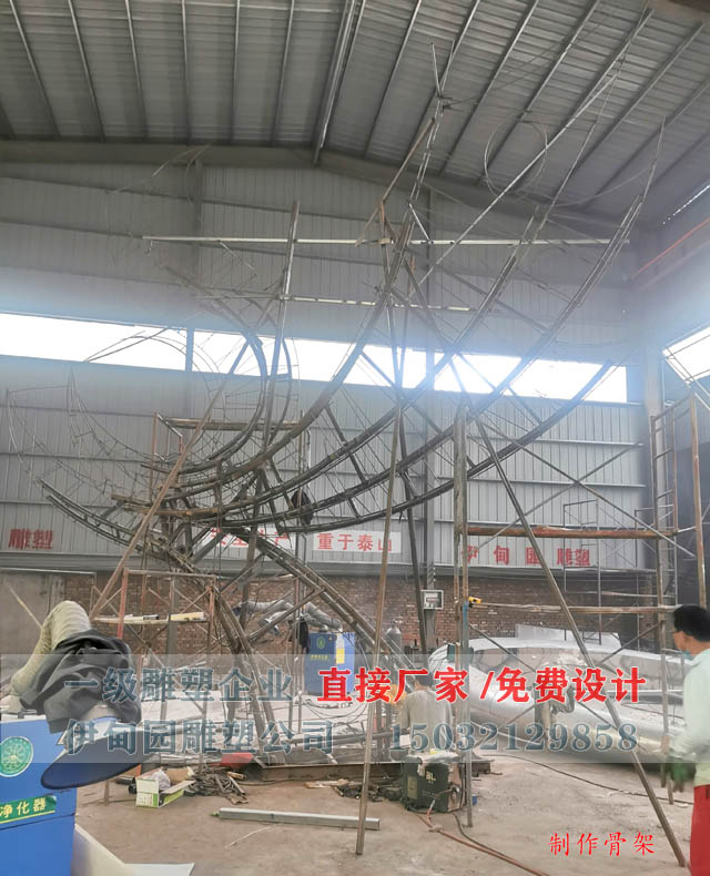 鳳凰雕塑內(nèi)部骨架由Φ89mm圓管和Φ12mm鋼筋焊接組成,堅(jiān)實(shí)穩(wěn)固。雕塑骨架造型要符合雕塑的動(dòng)態(tài),所以制作骨架期間,工廠技術(shù)員和造型師會(huì)全程參與到骨架制作當(dāng)中,時(shí)時(shí)對(duì)比雕塑設(shè)計(jì)圖與骨架比例角度是否吻合,確保骨架自身的美感,以及鳳凰雕塑優(yōu)美的姿態(tài)與韻律感。