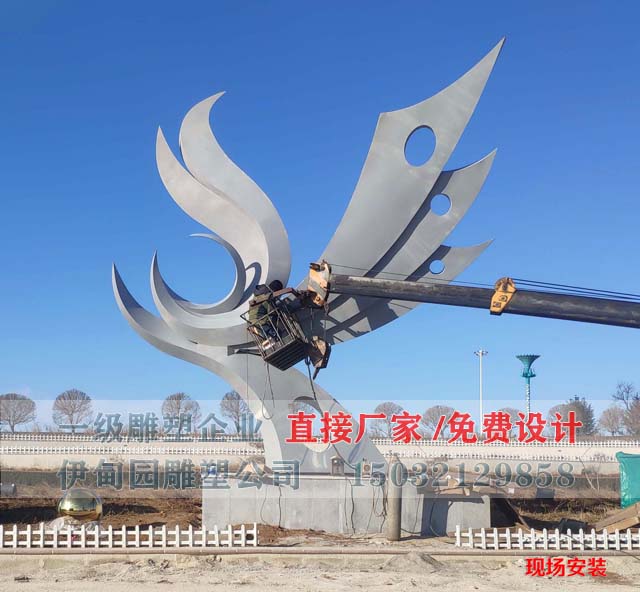 丹鳳朝陽雕塑(又稱鳳凰不銹鋼雕塑),高7.5米,長7米,不銹鋼304材質(zhì)制作,安裝于遼寧省某城市廣場。鳳凰不銹鋼雕塑制作流程:確認(rèn)設(shè)計(jì)圖→制作雕塑骨架→裁料鍛造→組裝焊接→打磨拋光→物流運(yùn)輸→現(xiàn)場組裝→噴漆整形。