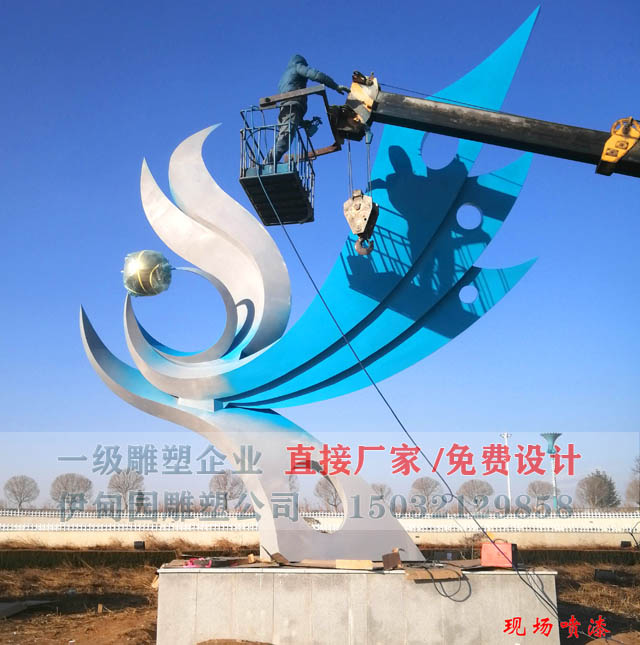 鳳凰雕塑尺寸較大,我們選擇分塊運(yùn)輸,雕塑運(yùn)達(dá)施工現(xiàn)場,進(jìn)行組裝拼接,整體安裝完成以后,噴漆師傅在給雕塑開始噴涂防銹底漆和藍(lán)色面漆。噴漆之前,員工會(huì)提前把雕塑表面清理干凈,保證雕塑漆面的平整與穩(wěn)定性。