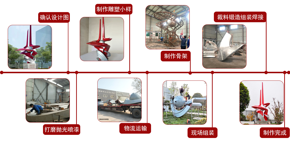 丹鳳朝陽雕塑(又稱鳳凰不銹鋼雕塑),高7.5米,長7米,不銹鋼304材質(zhì)制作,安裝于遼寧省某城市廣場。鳳凰不銹鋼雕塑制作流程:確認(rèn)設(shè)計(jì)圖→制作雕塑骨架→裁料鍛造→組裝焊接→打磨拋光→物流運(yùn)輸→現(xiàn)場組裝→噴漆整形。